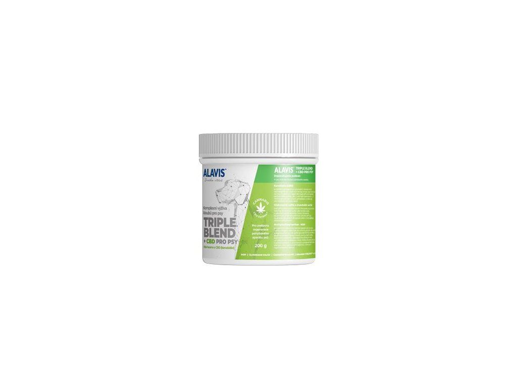 ALAVIS™ Triple Blend + CBD pro psy obsahuje látku CBD (kanabidiol) spolu s kombinací chondroprotektivních látek (glukosamin sulfátu a chondroitin sulfátu), látky MSM a značkových kolagenů a COLLYSS™ a CARTIDYSS™.
