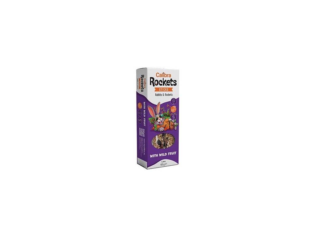 Calibra Rockets Sticks Rabbits & Rodents Wild Fruit jsou pochoutkou určenou pro králíky, morčata, činčily a další hlodavce. Dvě tyčinky s obsahem divokých plodů jsou plné dalších jejich oblíbených ingrediencí. Tyčinky jsou vyráběné ručně a jsou balené v ochranné atmosféře pro maximální zachování čerstvosti. Tyčinky mají závěsný systém, který umožňuje zavěšení na okraj terária nebo mřížku u klece.