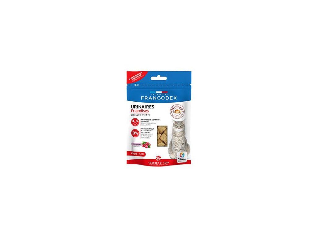 Kočky přirozeně pijí velmi málo. Omezená fyzická aktivita, věk, stres a nadváha jsou některé z faktorů, které mohou vést k rozvoji močových problémů. Pamlsky FRANCODEX URINARY TREATS, které jsou vyrobeny s kombinací rostlin, obsahují brusinky, které se používají při močových potížích, šantu kočičí a aminokyseliny, které přispívají k pohodě koček.