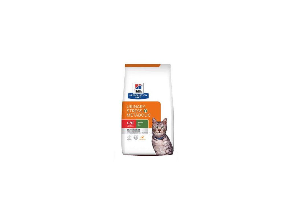 Hill's PRESCRIPTION DIET c/d Multicare Stress + Metabolic krmivo pro kočky s kuřetem je kompletní dietetické krmivo pro rozpuštění struvitových kamenů, snížení recidivy struvitových kamenů (příčiny onemocnění dolních močových cest u koček, FLUTD), omezení tvorby oxalátových kamenů a pro snížení nadměrné tělesné hmotnosti u dospělých koček. Toto krmivo má nízkou hustotu energie, vytváří prostředí nevhodné pro tvorbu struvitu, podporuje zásaditost moči a má nízký obsah hořčíku, vápníku a vitaminu D.