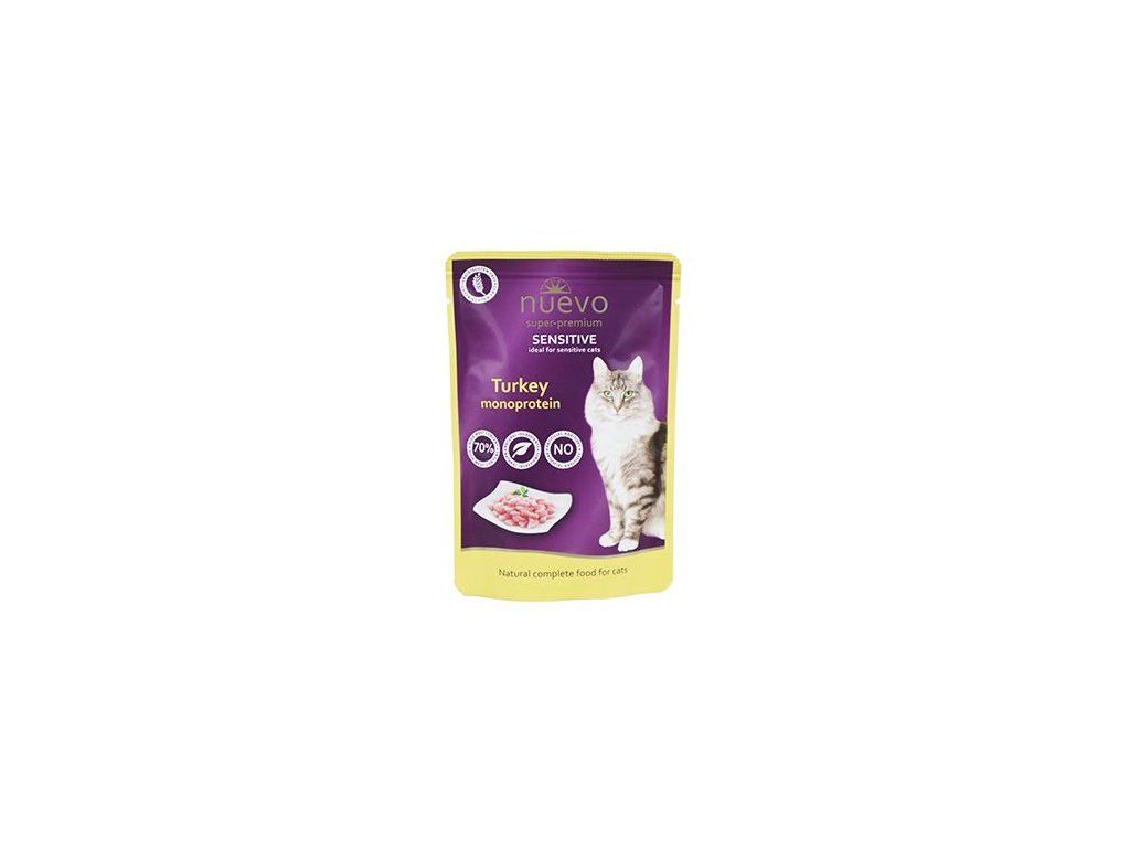 Krmivo Nuevo kočka sensitive Krůtí monoprotein je kompletní krmivo pro dospělé kočky všech plemen s citlivým zažíváním obohaceno o krůtí maso. Vysoký obsah masa a přírodních surovin, žádné umělé přísady, obiloviny či lepek dělají z tohoto krmiva opravdu vysoce kvalitní pochoutku, kterou si zamilují i ty nejvybíravější kočičky!