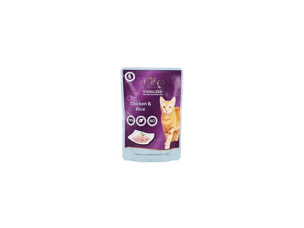 Krmivo Nuevo sterilized drůbeží s rýží je kompletní krmivo pro kastrované kočky všech plemen, obohaceno o drůbeží maso s rýží. Vysoký obsah masa a přírodních surovin, žádné umělé přísady, obiloviny či lepek dělají z tohoto krmiva opravdu vysoce kvalitní pochoutku, kterou si zamilují i ty nejvybíravější kočičky!