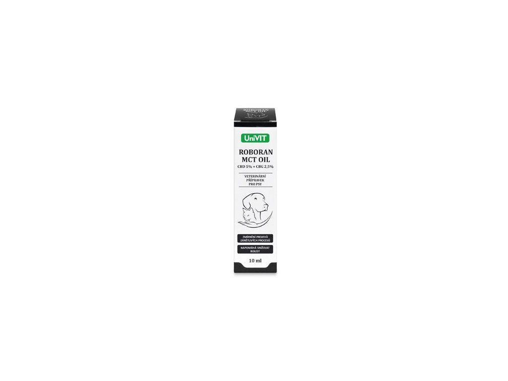 Roboran MCT OIL CBD 5% + CBG 2,5% je schválený veterinární přípravek, ve formě kapek využívající široké spektrum účinků přírodního kanabidiolu a kanabigerolu. Kanabinoidní složky jsou rozpuštěny v MCT oleji, který je získáván šetrně z kokosového oleje.