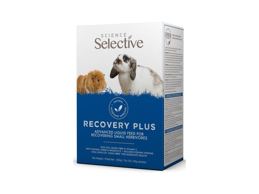 RecoveryPlus je jedinečná receptura, která po smíchání s vodou poskytuje tekutou stravu s vysokým obsahem vlákniny a energie a pomáhá stabilizovat střevní flóru. Krmivo je sestaveno z různých surovin tak, aby podporovalo střevní činnost, stabilizaci prospěšných střevních bakterií a imunitní systém. RecoveryPlus má vysoký obsah bílkovin, vlákniny, vitaminů, probiotik a bylin, které jsou nezbytné během kritického období a napomáhají upravit trávení. Je směsí ingrediencí s dlouhými kousky vlákniny, umožňující snadnou průchodnost trávicím systémem. Povzbuzuje pohyb střev a napomáhá rehydrataci. Podporuje chuť k jídlu využitím stravitelných a chutných ingrediencí. Doporučuje se k RecoveryPlus postupně přidávat suché krmivo Supreme Selective.