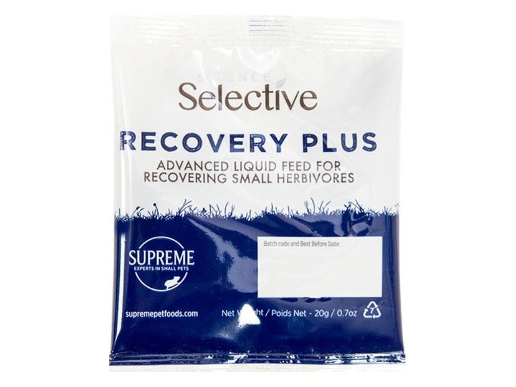 RecoveryPlus je jedinečná receptura, která po smíchání s vodou poskytuje tekutou stravu s vysokým obsahem vlákniny a energie a pomáhá stabilizovat střevní flóru. Krmivo je sestaveno z různých surovin tak, aby podporovalo střevní činnost, stabilizaci prospěšných střevních bakterií a imunitní systém. RecoveryPlus má vysoký obsah bílkovin, vlákniny, vitaminů, probiotik a bylin, které jsou nezbytné během kritického období a napomáhají upravit trávení. Je směsí ingrediencí s dlouhými kousky vlákniny, umožňující snadnou průchodnost trávicím systémem. Povzbuzuje pohyb střev a napomáhá rehydrataci. Podporuje chuť k jídlu využitím stravitelných a chutných ingrediencí. Doporučuje se k RecoveryPlus postupně přidávat suché krmivo Supreme Selective.
