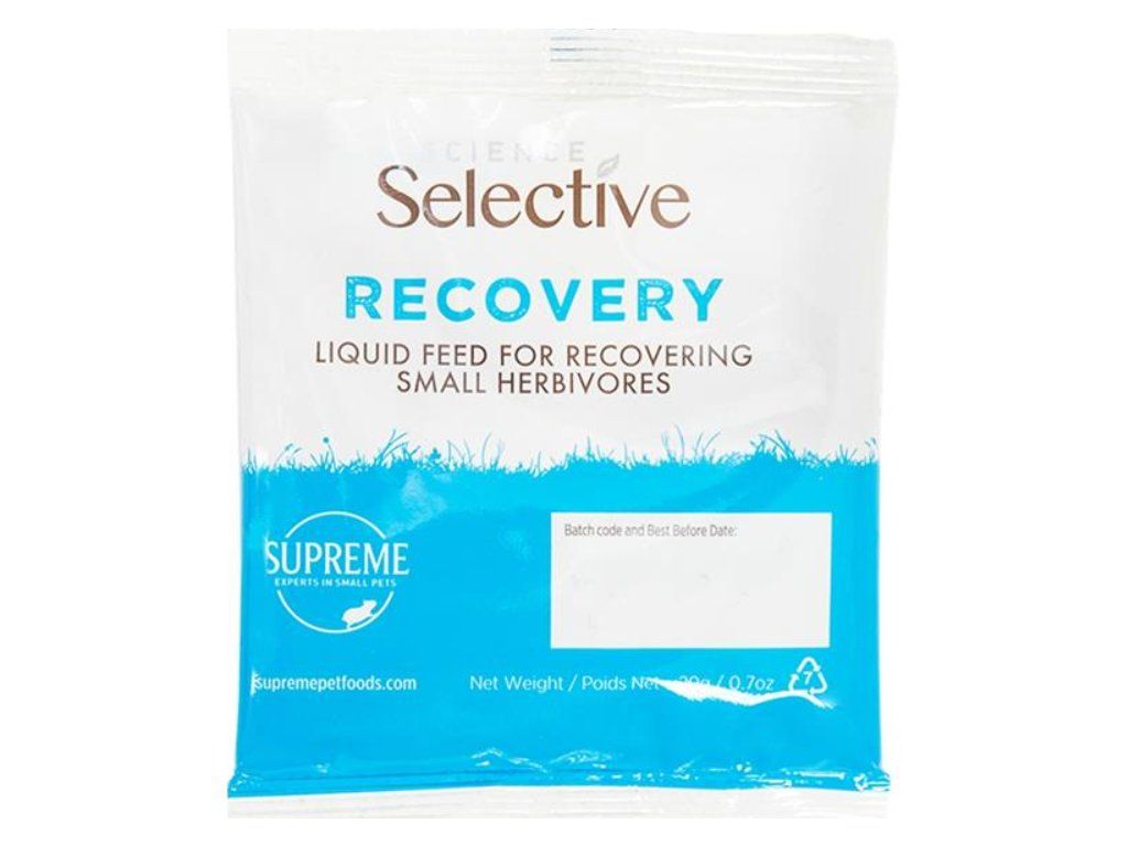 Recovery je jedinečná receptura, která po smíchání s vodou poskytuje tekutou stravu s vysokým obsahem vlákniny a pomáhá stabilizovat střevní flóru. Krmivo je sestaveno z různých surovin tak, aby podporovalo střevní činnost, stabilizaci prospěšných střevních bakterií a imunitní systém. Má vysoký obsah bílkovin, vlákniny a vitaminů, které jsou nezbytné během kritického období. Je směsí ingrediencí jemně rozemletých na prášek, umožňující snadnou průchodnost trávicím systémem. Povzbuzuje pohyb střev a napomáhá rehydrataci. Podporuje chuť k jídlu využitím stravitelných a chutných ingrediencí. Doporučuje se k Recovery postupně přidávat suché krmivo Supreme Selective.