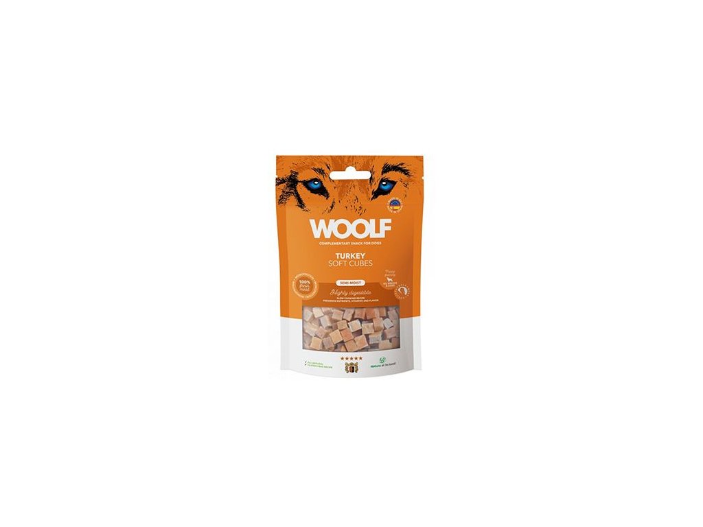 Woolf soft Cubes je pamlsek pro psy, který se může pochlubit charakteristickou polovlhkou texturou, odvozenou výhradně z přírodních ingrediencí. All-Natural: Tento termín označuje použití minimálně zpracovaných surovin bez jakýchkoli syntetických přísad, jako jsou barviva, příchutě nebo konzervační látky. Zcela přírodní pamlsky pro psy používají zdravé, rozpoznatelné složky běžně se vyskytující v přírodě, jako je pravé maso, zelenina, ovoce a obiloviny. Polovlhké: Polovlhké pamlsky pro psy slouží jako přechodná textura mezi suchými psími sušenkami a mokrým krmivem v konzervě. Jsou měkké, poddajné, lehce žvýkací a mají vyšší obsah vlhkosti než tradiční suché pamlsky, což psům usnadňuje jejich žvýkání a poskytuje chutnější zážitek.